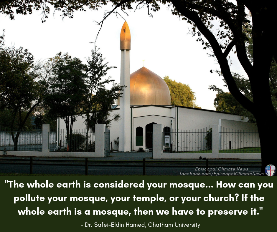 Pictured: A Reuters image of the Al Noor Mosque in Christchurch, with a quote from Dr. Safei-Eldin Hamed of Chatham University to help us better understand the heart of Islam. “The whole earth is considered your mosque… How can you pollute your mosque, your temple, or your church? If the whole earth is a mosque, then we have to preserve it.” You can watch Dr. Hamed’s full interview with the Forum on Religion and Ecology at Yale at https://www.youtube.com/watch?v=4p3BqAzvWdc