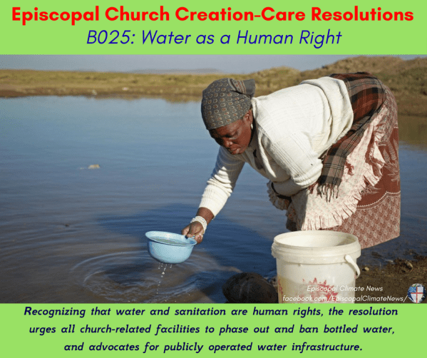 This year, General Convention -- the legislative governing body of the Episcopal Church -- passed 19 resolutions for the care of God's creation. Each Tuesday, we feature one here! Share on Facebook 2018-B025: "Water as a Human Right" Recognizing that water and sanitation are human rights, the resolution urges all church communities and facilities to... Continue Reading →